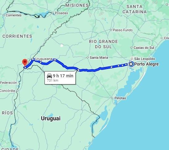 Saindo de Porto Alegre, sรฃo aproximadamente 9 horas de viagem atรฉ Barra do Quaraรญ, regiรฃo de trรญplice fronteira entre Brasil, Uruguai e Argentina.